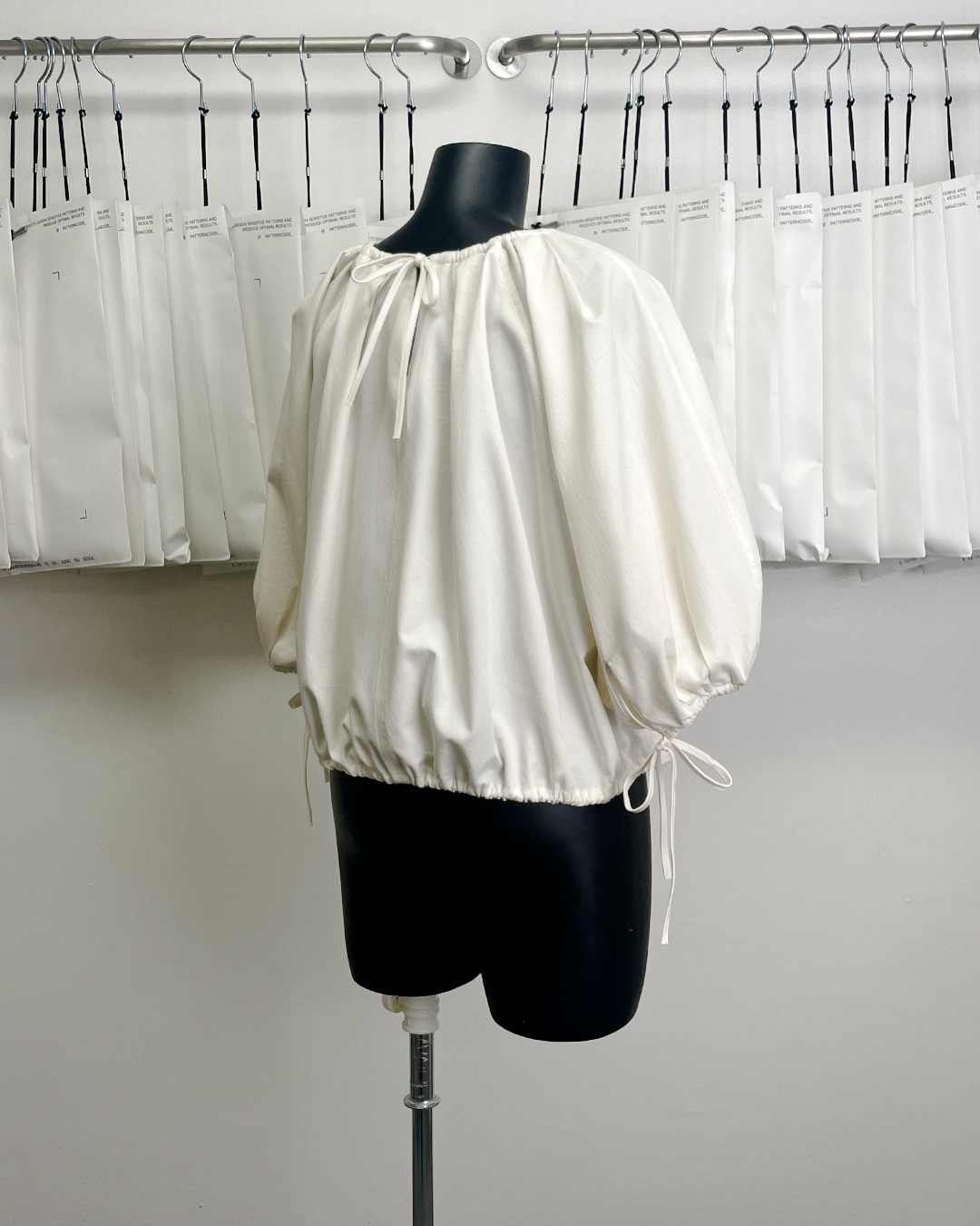 · A blouse featuring a pumpkin silhouette with gathered and pleated details.