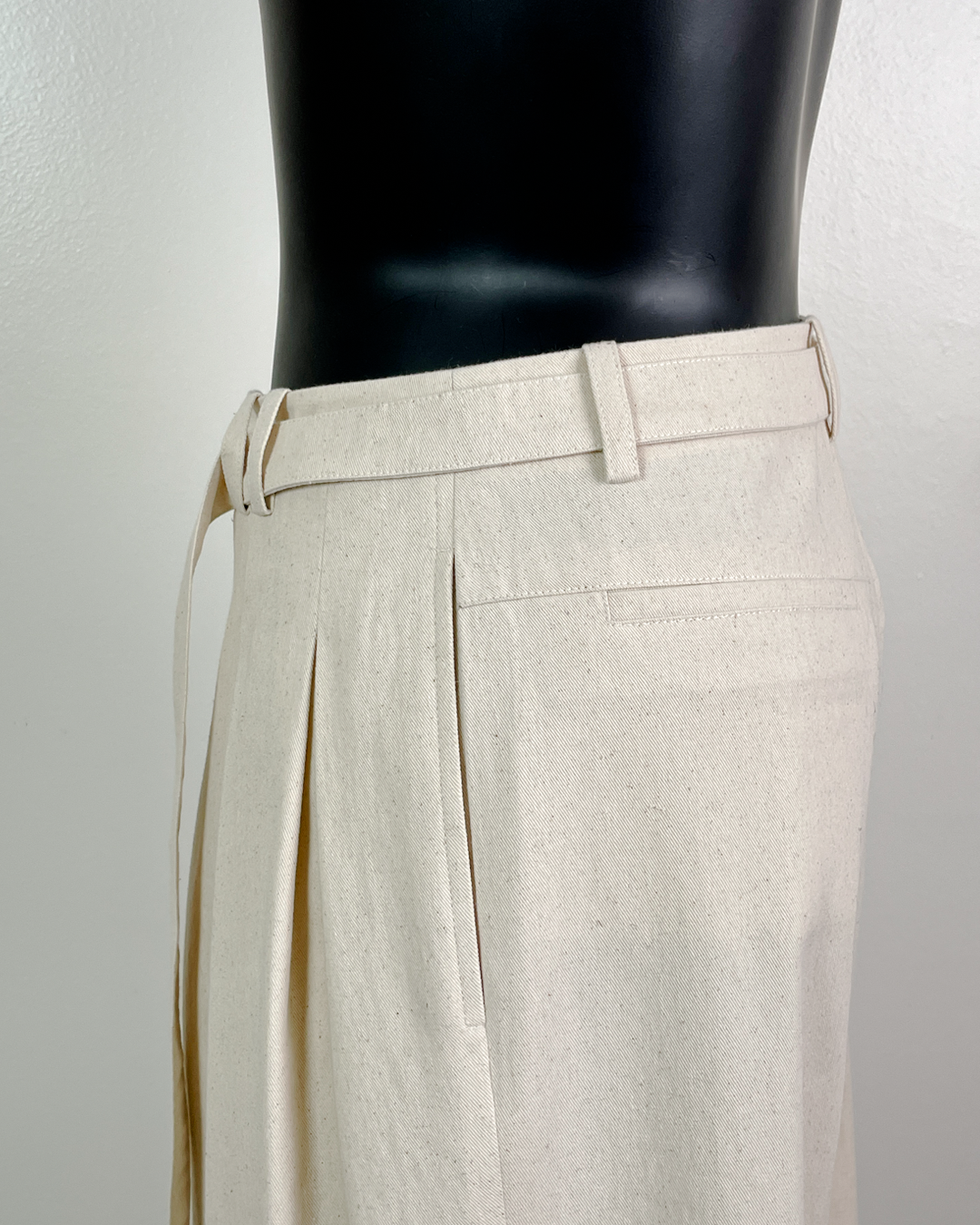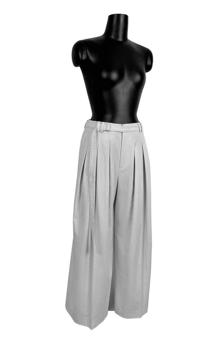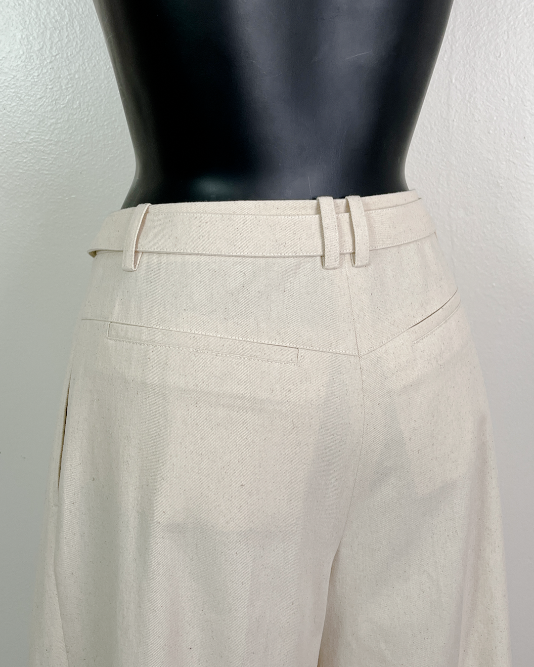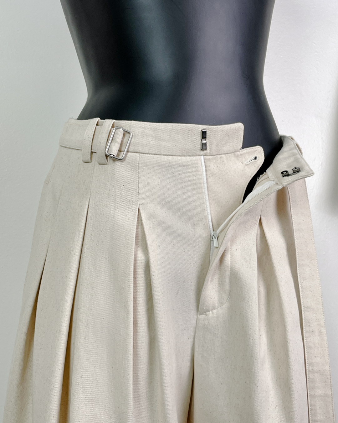 · These wide-leg slacks feature a relaxed silhouette with three reverse tucks.