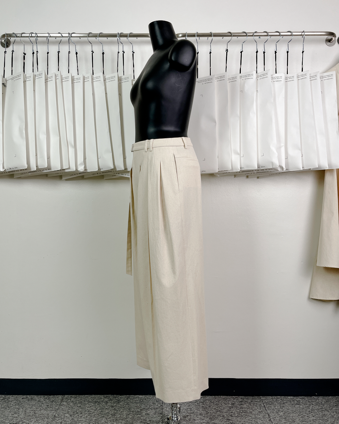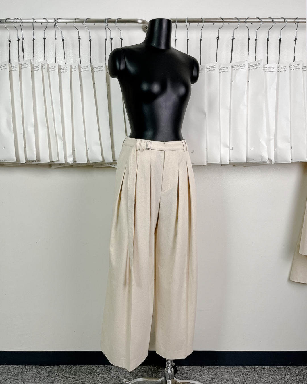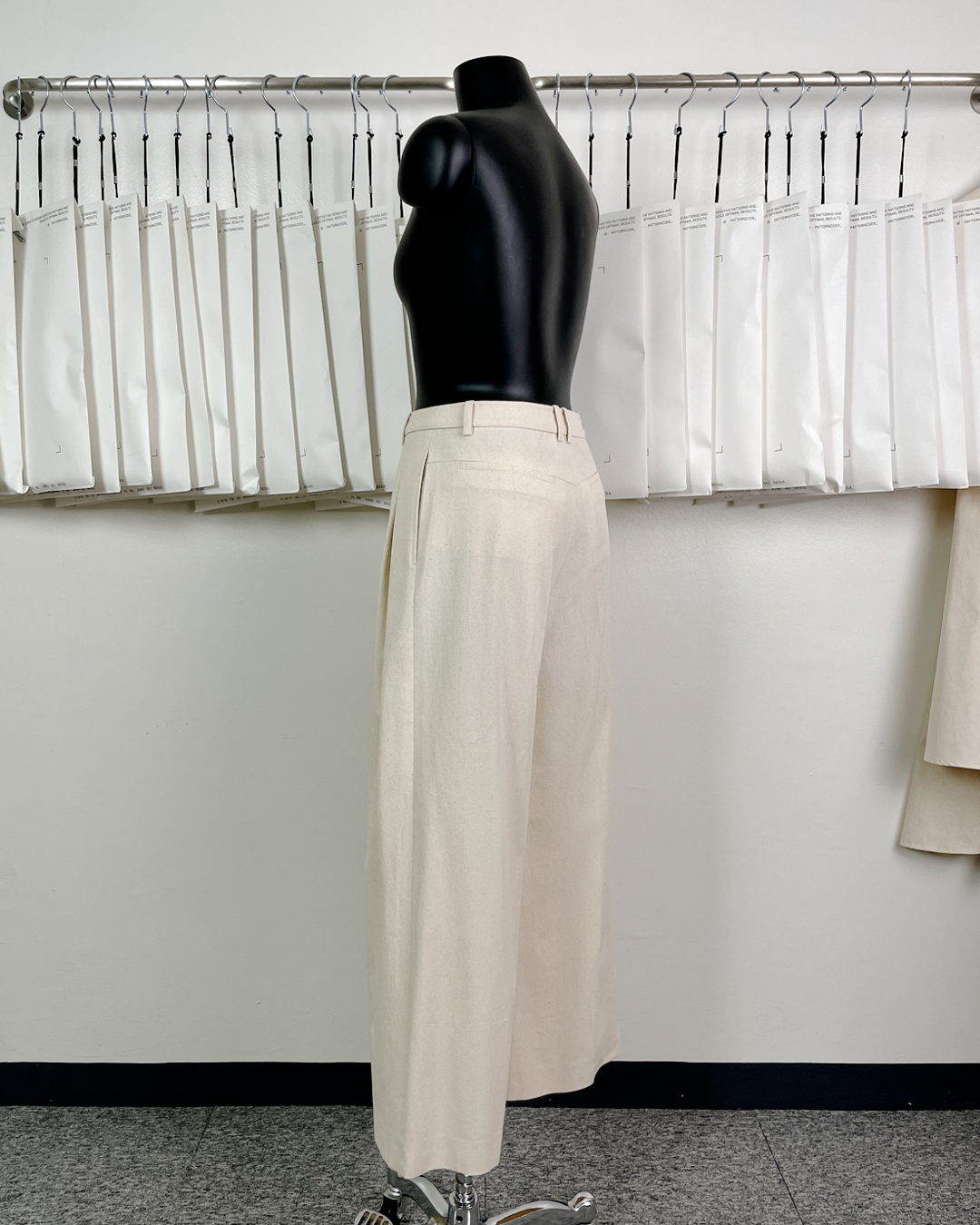 · These wide-leg slacks feature a relaxed silhouette with three reverse tucks.