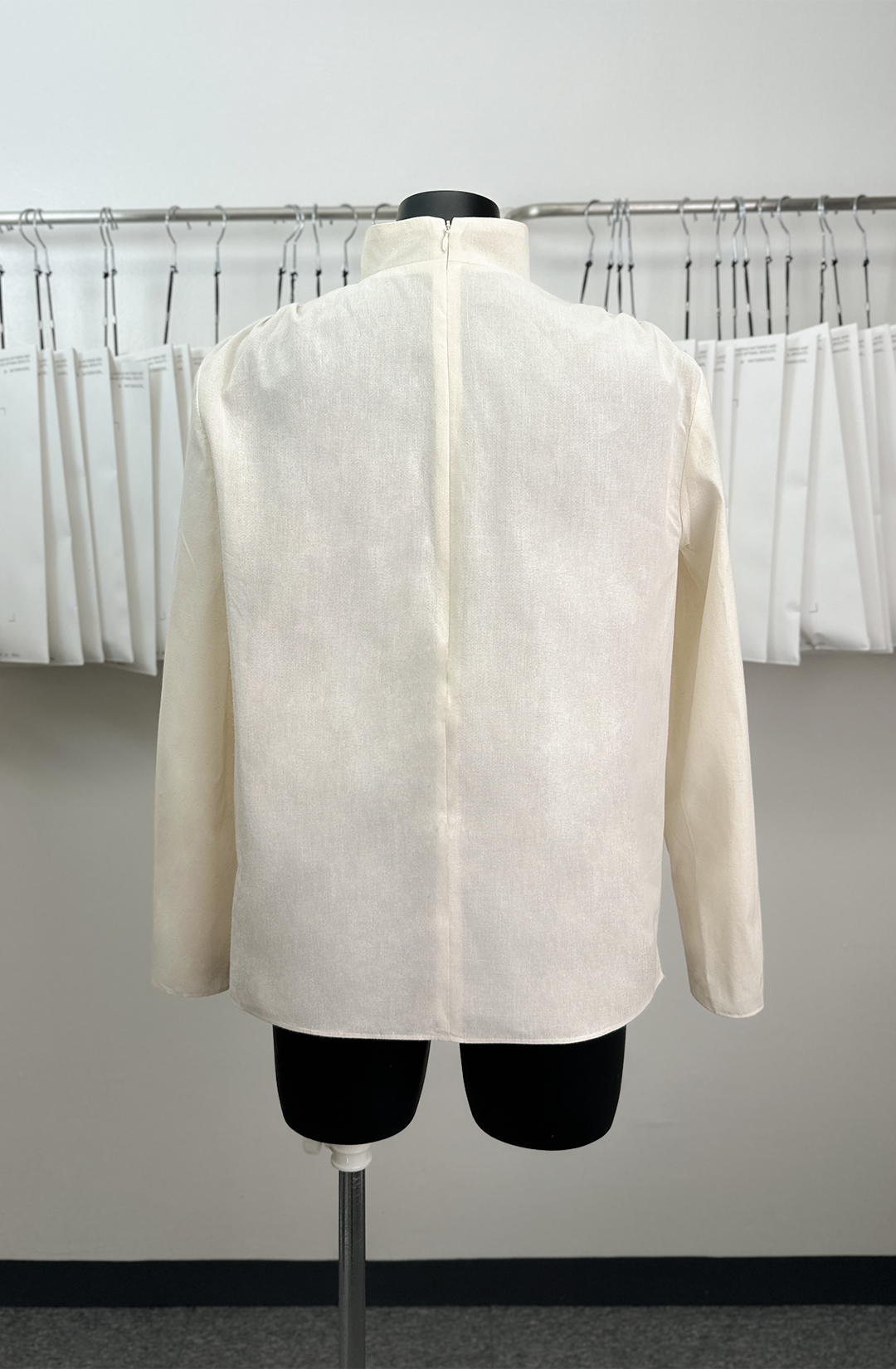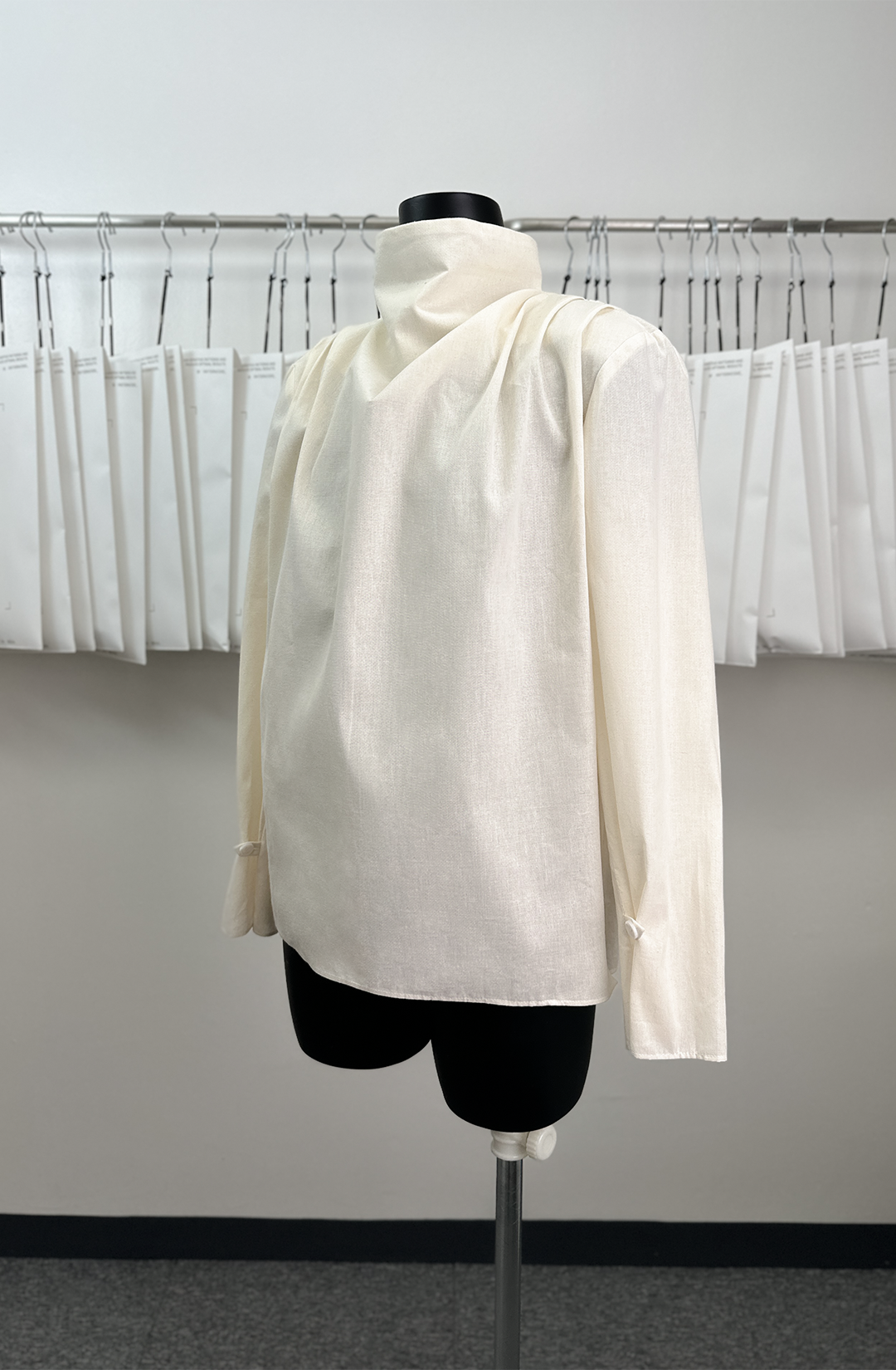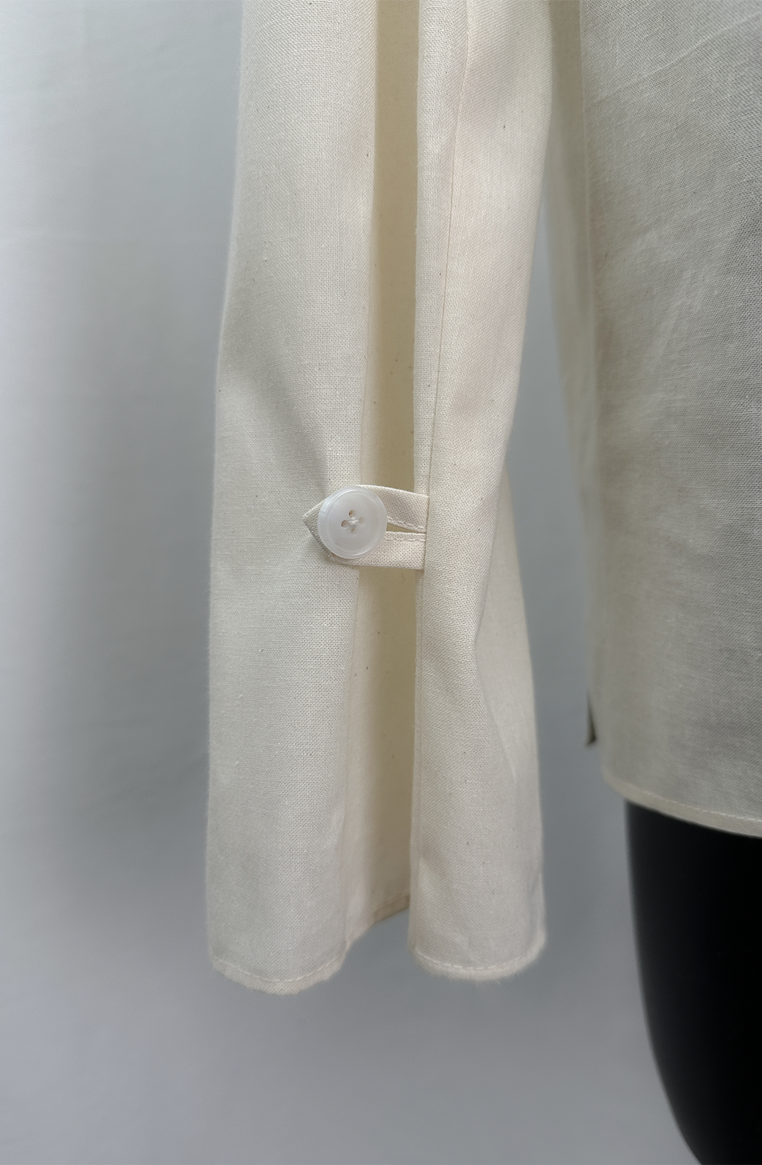 · There is a button and rouleau loop on the sleeve hem, so you can button on the sleeve to create a voluminous shape.