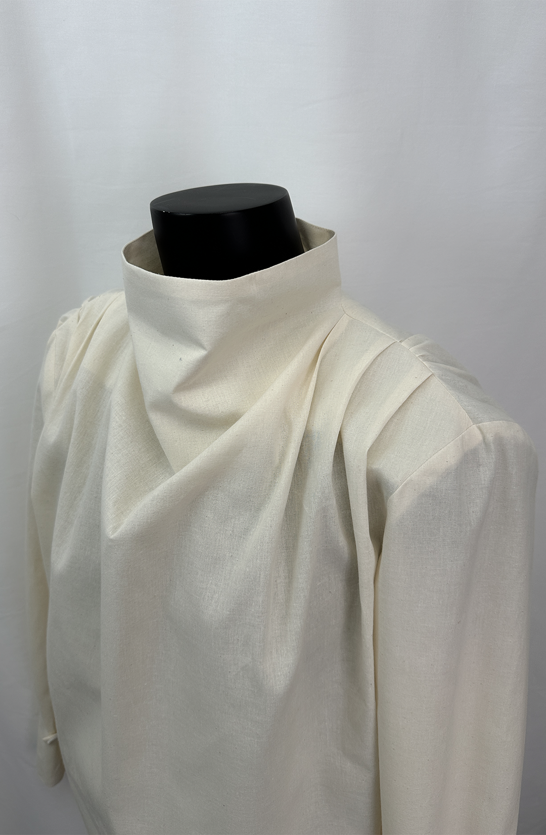 · The asymmetric tuck detail placed on both shoulders further maximizes the drapery of the cowl neck.