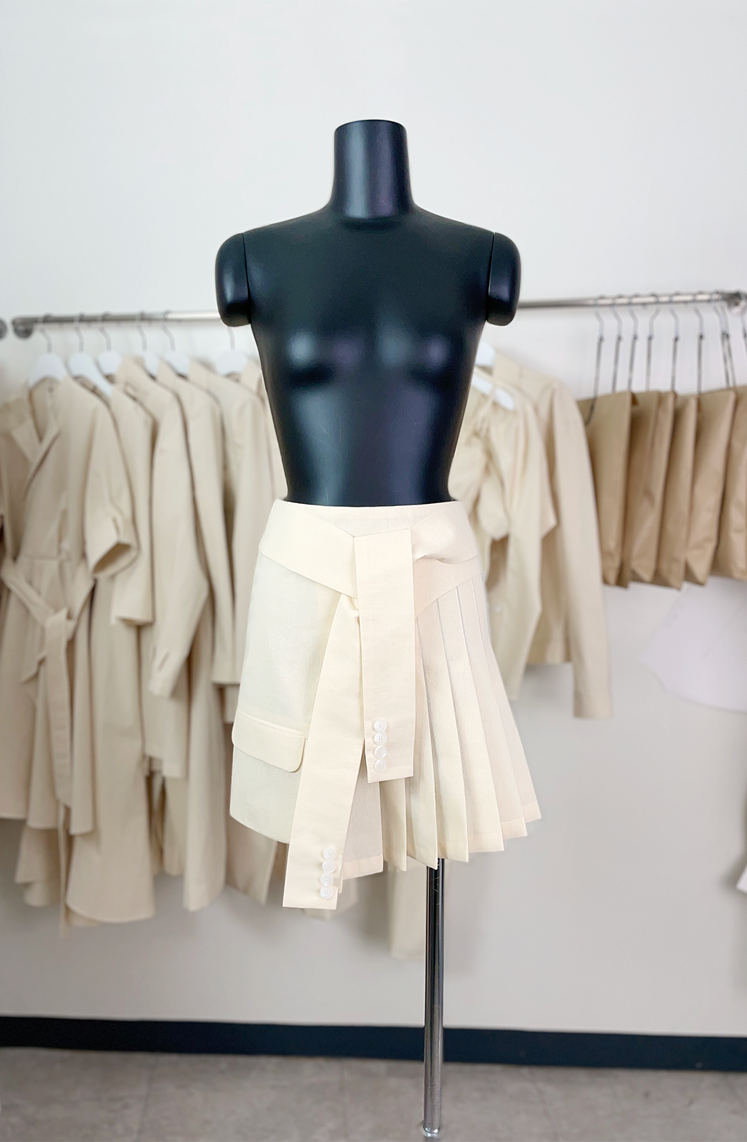 · This wrap pleated skirt is designed with the cut blazer's hemline and sleeve details.