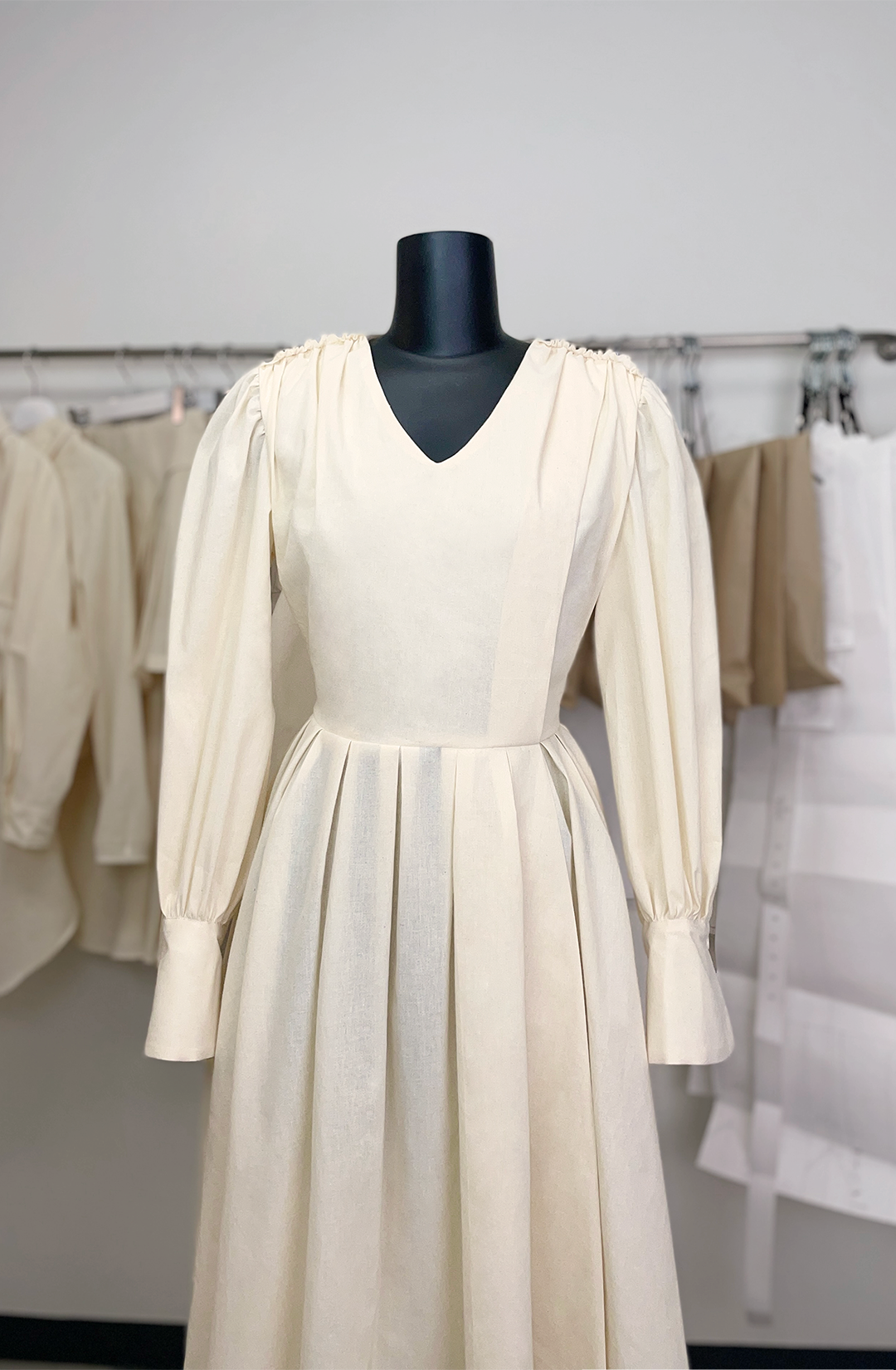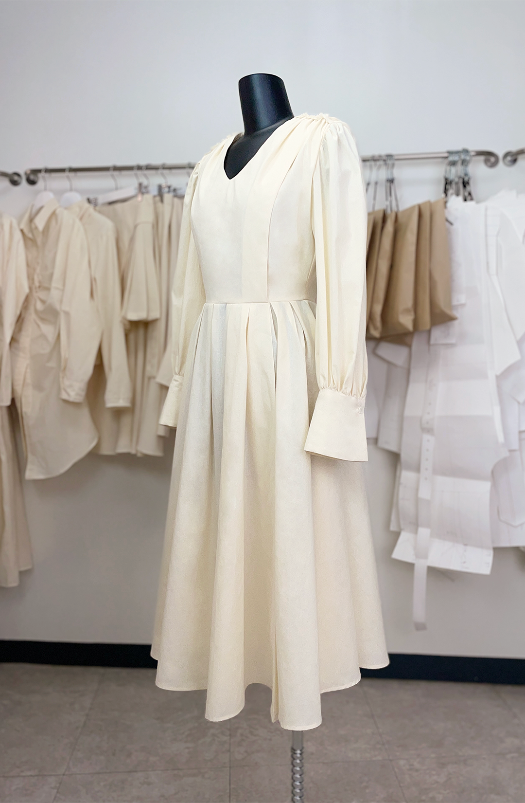 · A similar amount of shirring is applied to the armhole and sleeve hem to create natural volume.