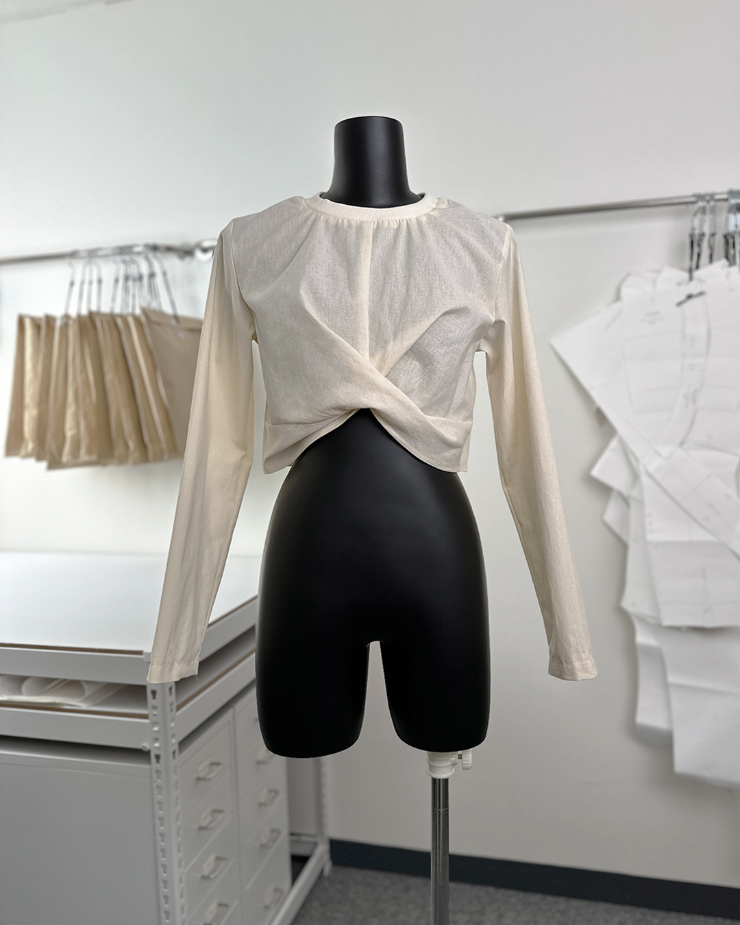 · It's It's a long-sleeved T-shirt with an attractive twist design on the front.