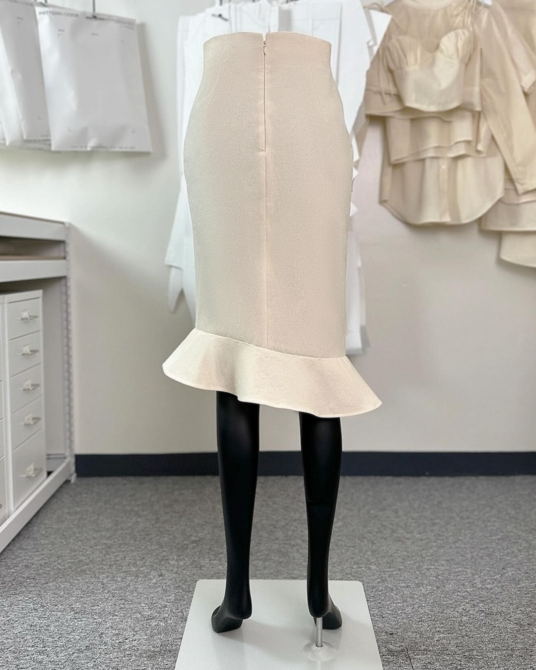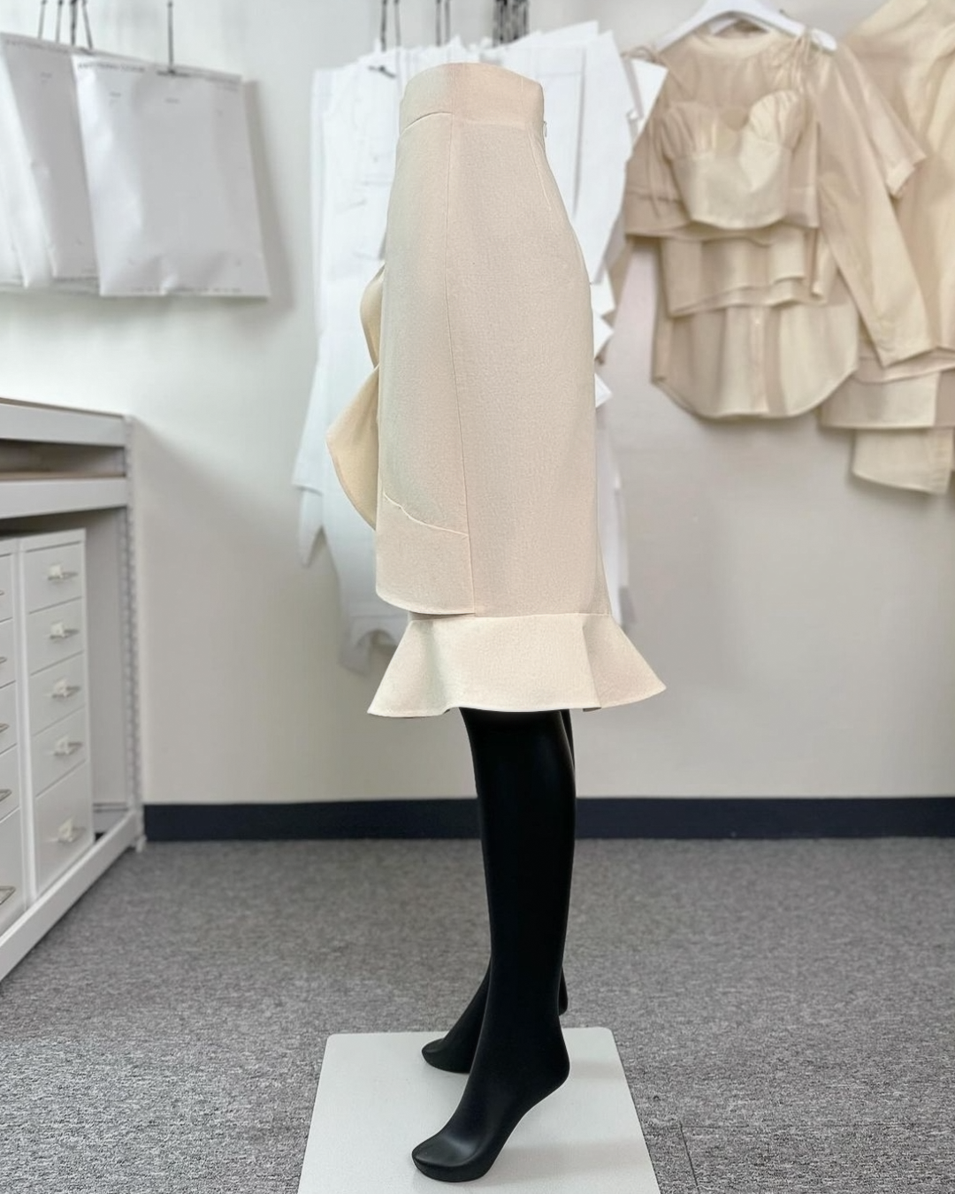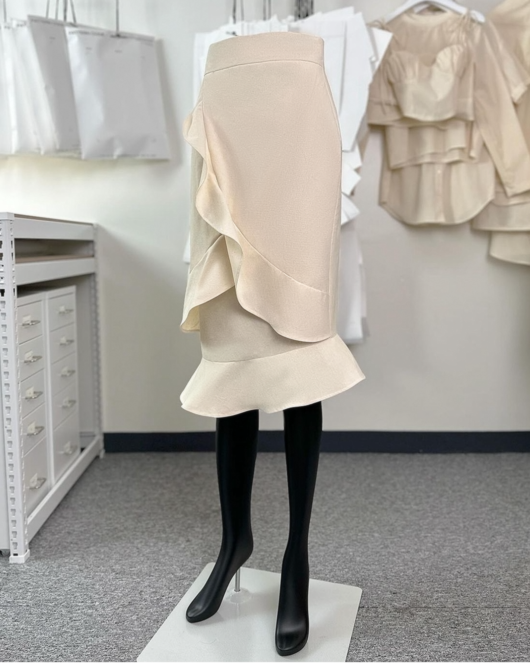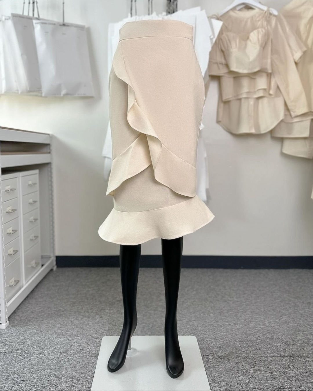 · This high-waisted skirt is adorned with ruffle decorations on the overlapping panels beneath the waistline, adding a touch of elegance and femininity.