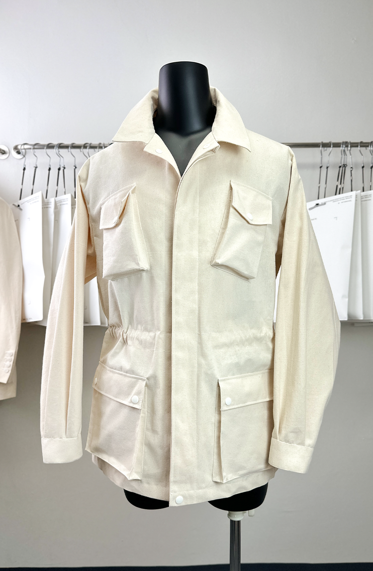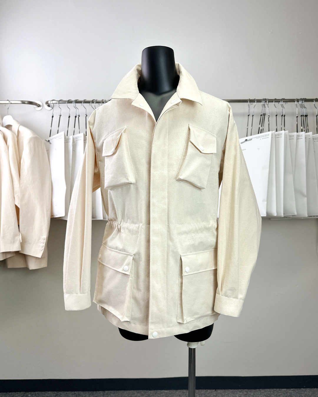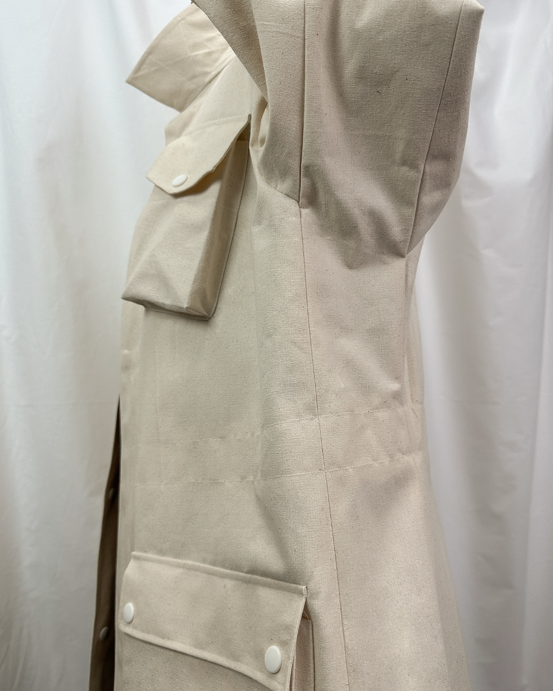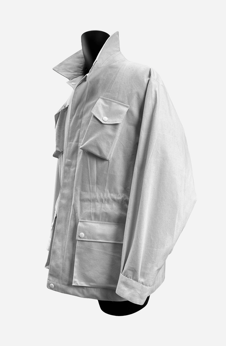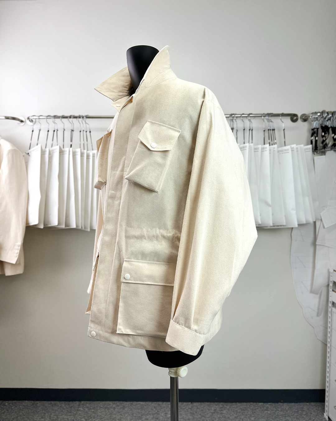 · It features a three-dimensional pocket on the front and a uniquely structured side panel that connects to the sleeves.