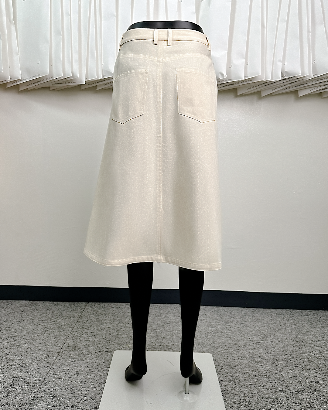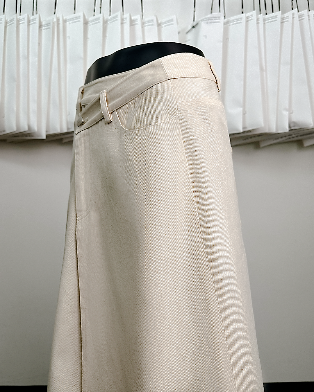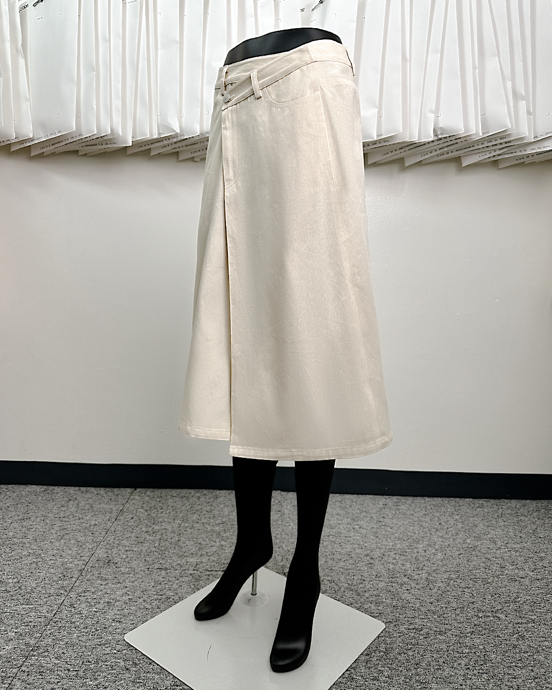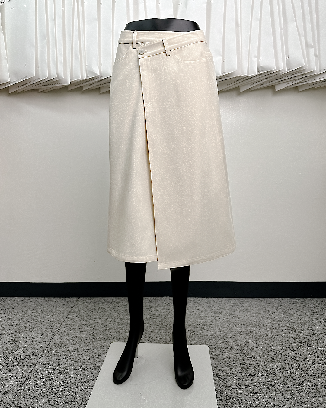 · This is a wrap-style skirt with an A-line silhouette with an unbalanced length.