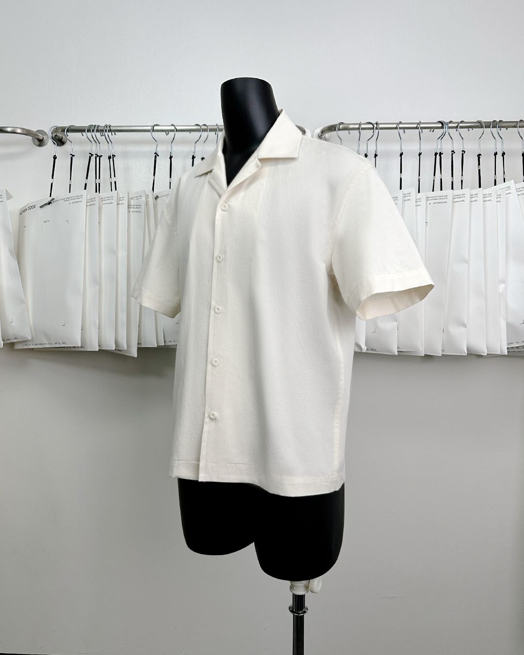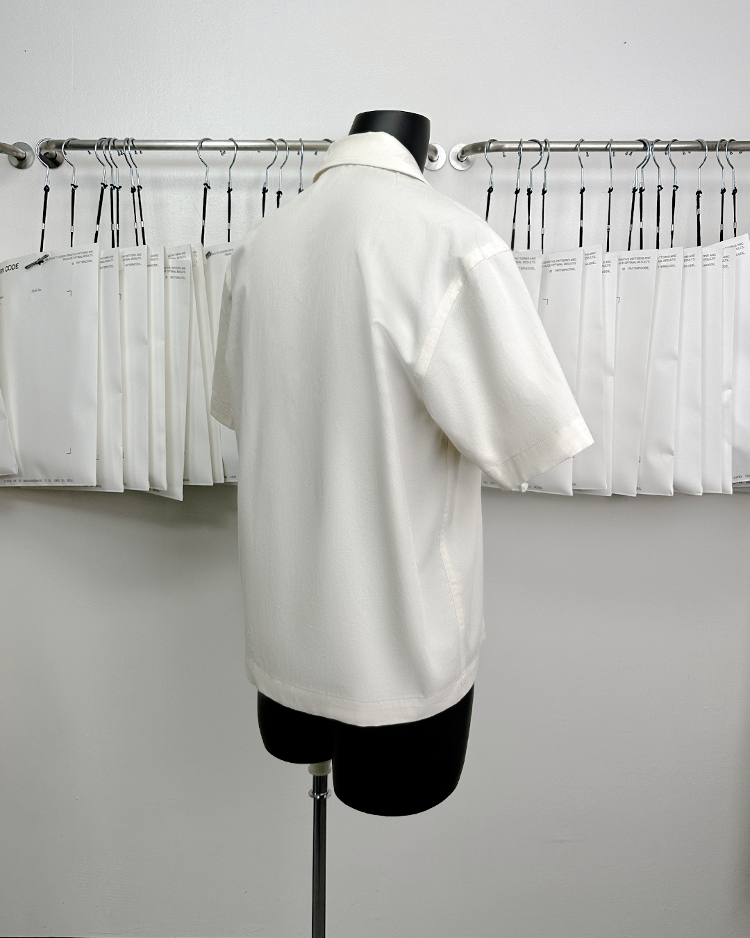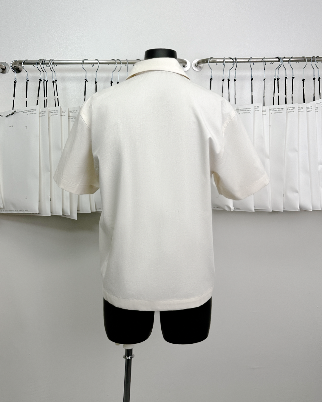 · This is a minimalist designed shirt decorated with an open collar and stitching.