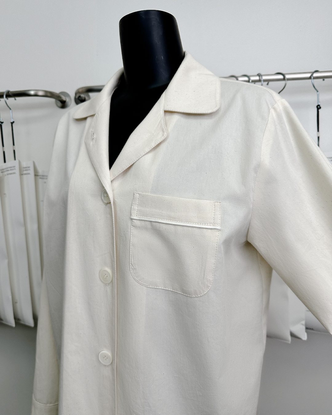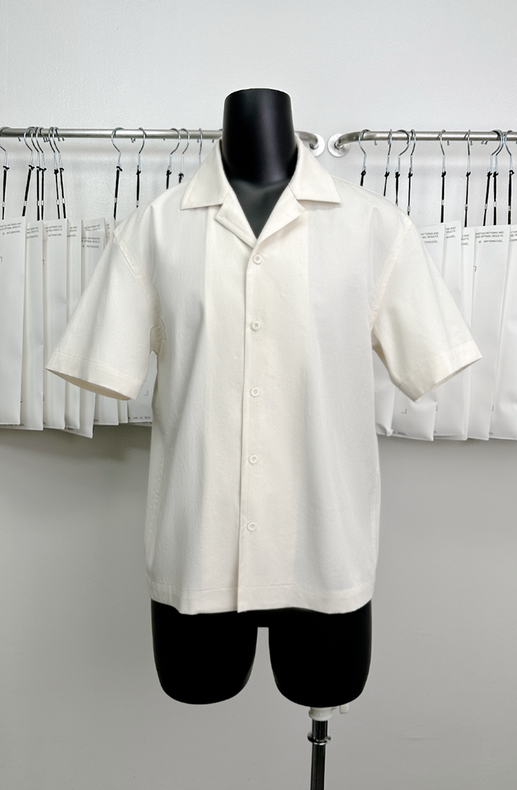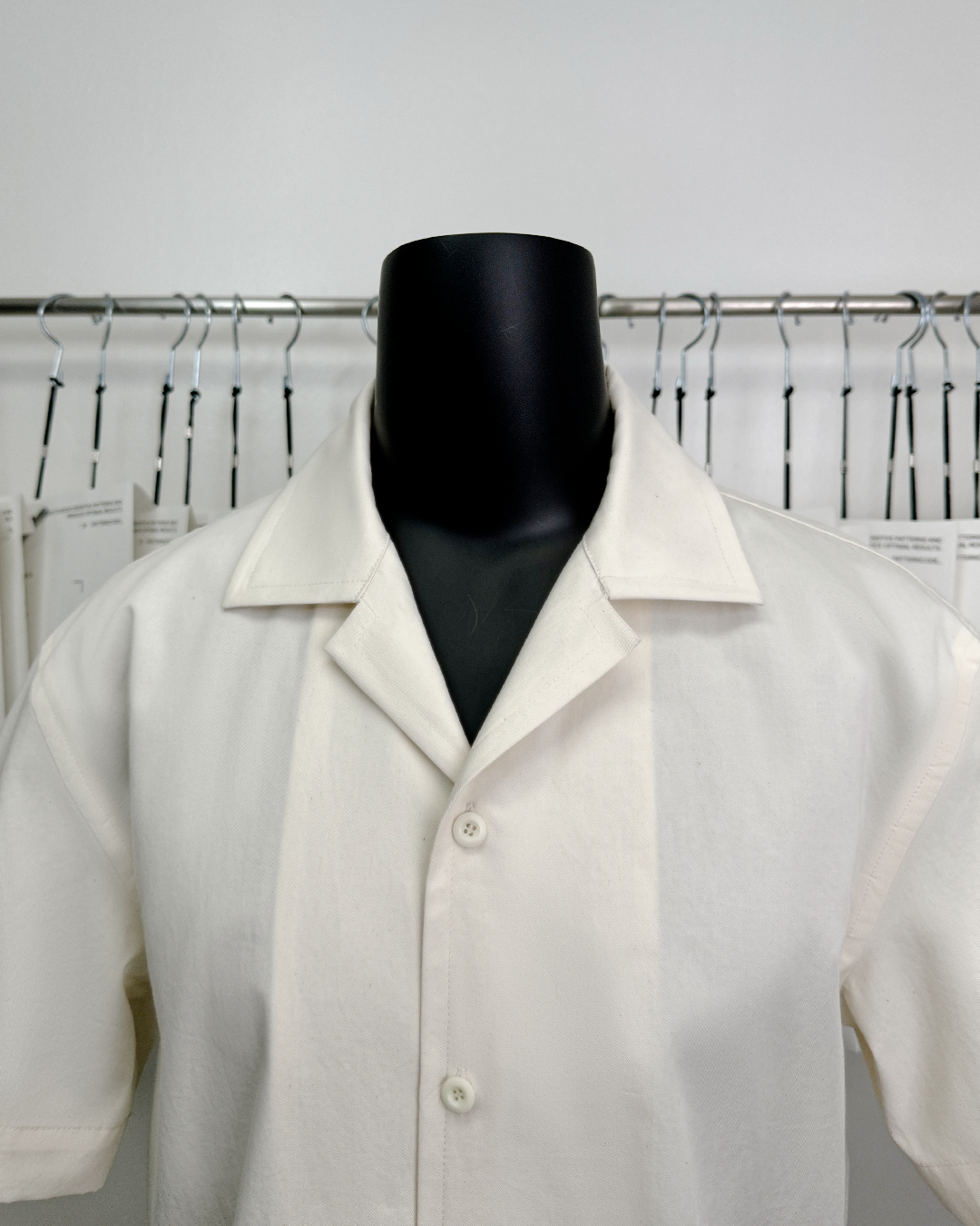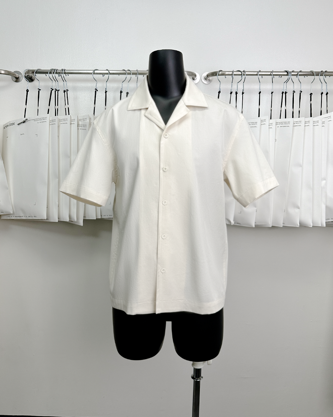· This is a minimalist designed shirt decorated with an open collar and stitching.